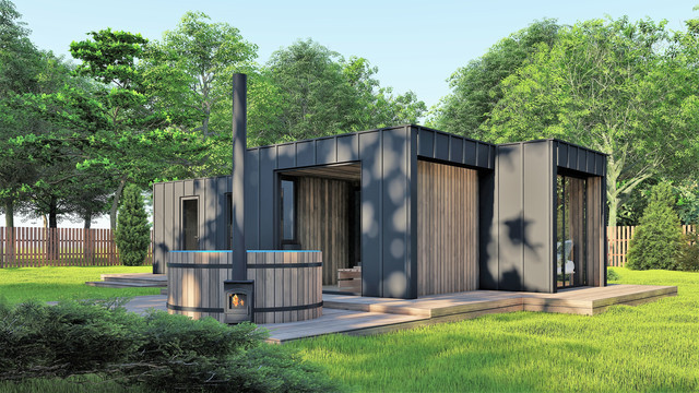 В даний час розроблено різні проекти модульних лазень із панорамним склінням. Новий тренд – це сауни витонченої форми в стилі Хайтек білого, сірого або навіть чорного кольору з великими панорамними вікнами, без жодних надмірностей, у стилі котеджів, біля яких вони збудовані.
